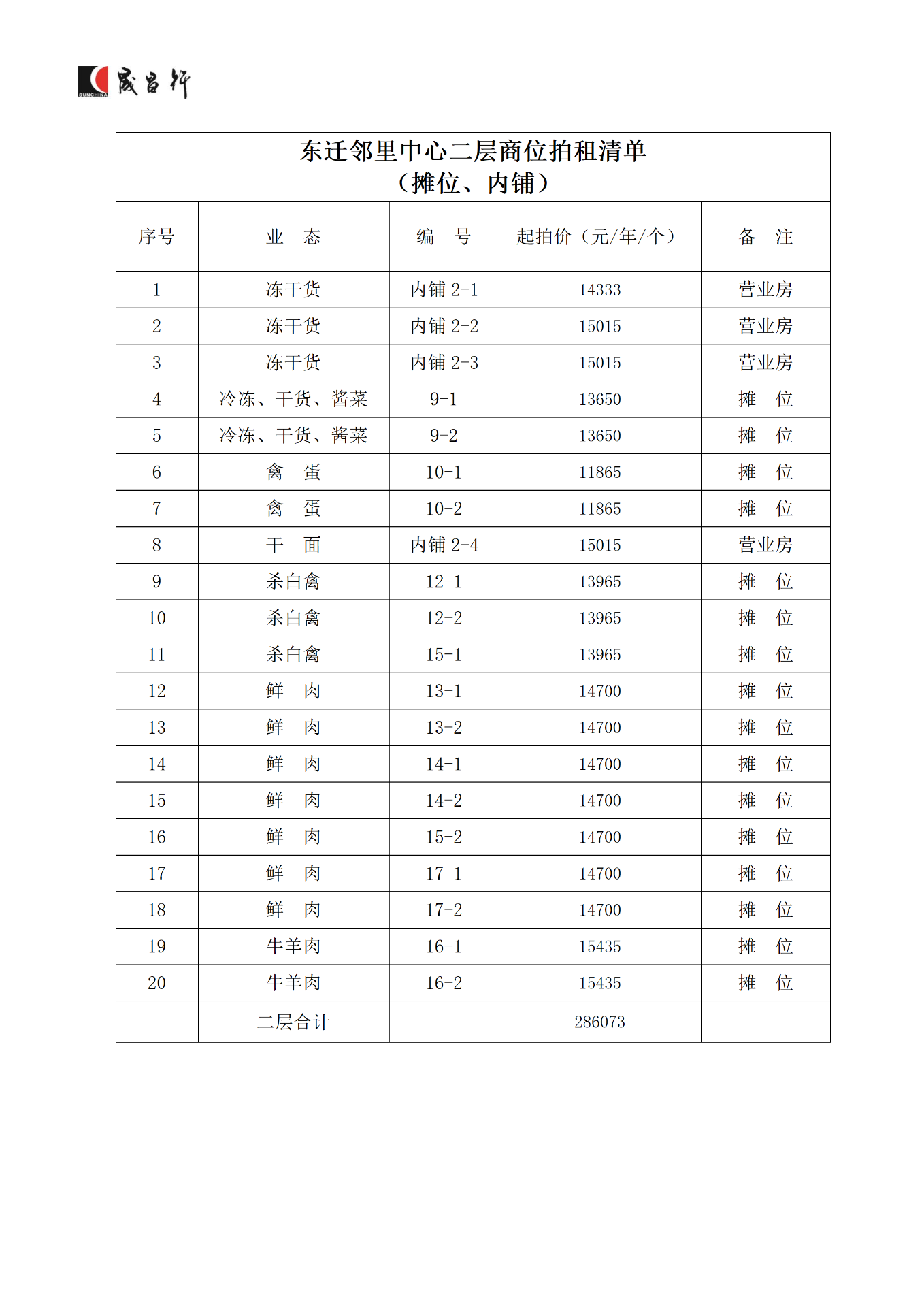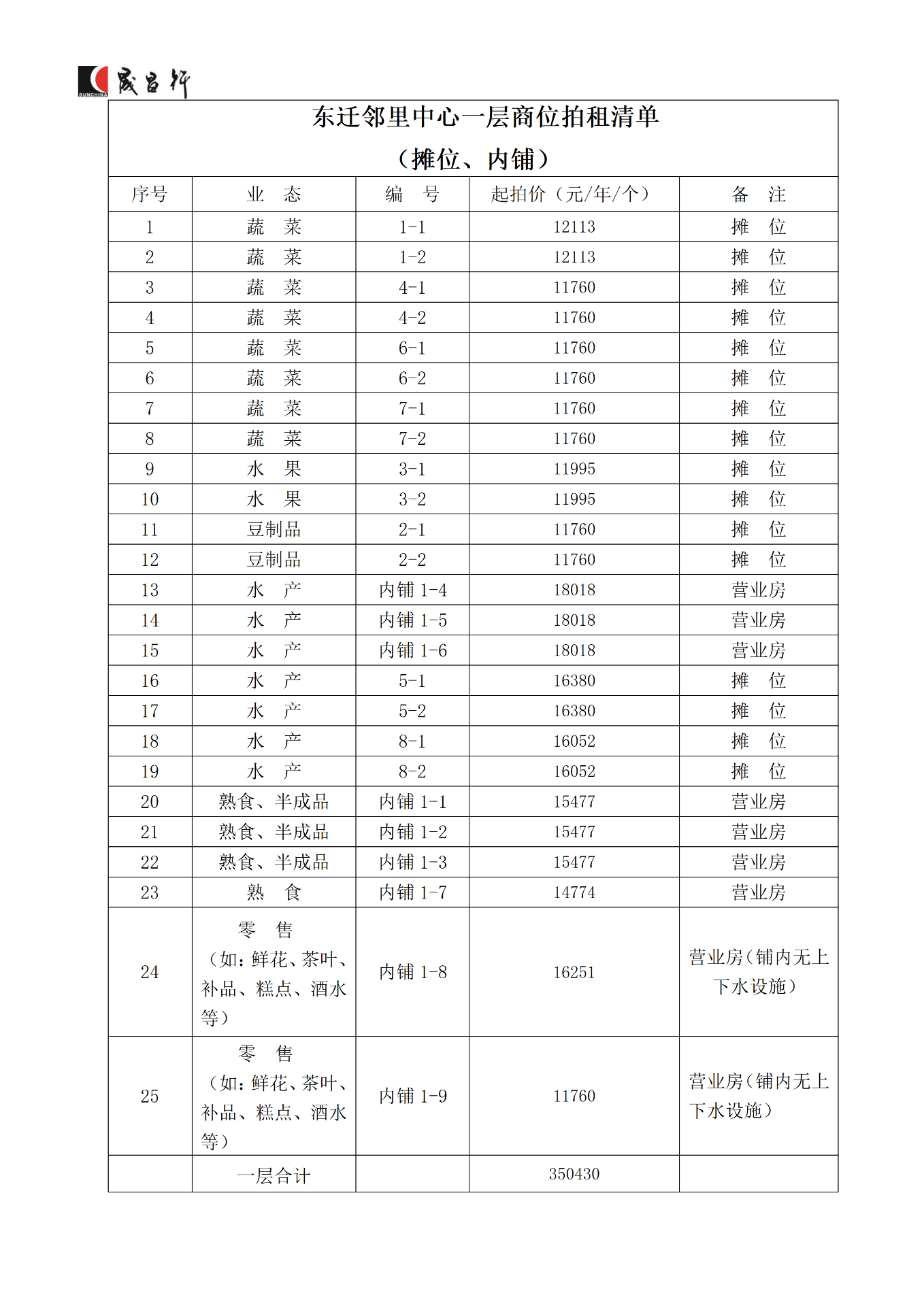 浙江省湖州市東遷鄰里中心1-2層攤位、內(nèi)鋪商位二年租賃權(quán),經(jīng)營范圍包括蔬菜、水產(chǎn)、禽蛋等行業(yè)。具體商位編號、業(yè)態(tài)、起拍價(jià)等詳見商位平面圖和拍租清單。